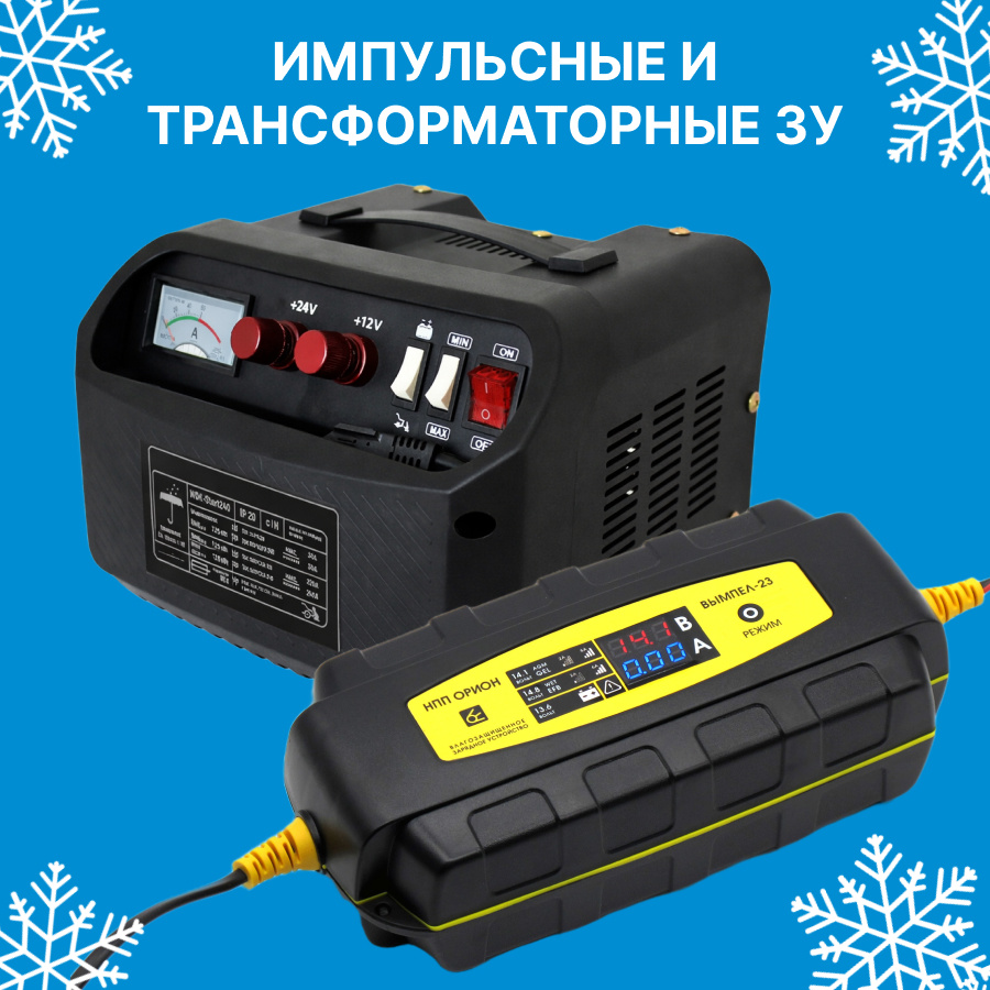 Импульсные и трансформаторные зарядные устройства - это два основных типа приборов для зарядки аккумуляторов, которые сильно отличаются по принципу работы, размеру, весу и режимам заряда. Импульсные зарядные устройства имеют ряд очевидных плюсов, особенно по сравнению с простыми трансформаторными ЗУ. Трансформаторное зарядное устройство — классический, хорошо проверенный тип, который активно используют до сих пор, но у него есть и явные ограничения. Зарядные устройства бренда Вымпел от НПП "Орион" относятся к импульсным зарядникам и полностью соответствуют стандартам современных ЗУ. Они генерируют высокочастотные импульсы тока с паузами, что обеспечивает эффективный заряд, автоматическую десульфатацию АКБ и защиту от перегрузок. Они выделяются полной автоматикой с интеллектуальными режимами (ручной, автоматический, буферный), автоматической десульфатацией, разрушающей сульфатные кристаллы во время заряда и возвращающей АКБ до 80–90% ёмкости даже от 0 В, поддержкой любых 12В батарей (G