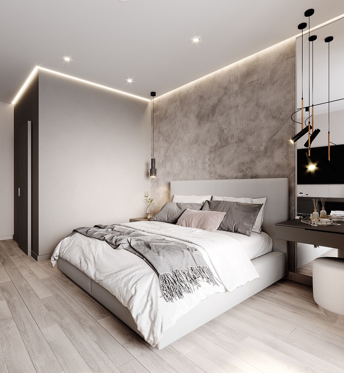 Свет, равномерно распределённый по периметру, заполняет пространство мягким светом. Яркая локальная лампа создает тени, уменьшающие восприятие площади, тогда как парящий потолок с подсветкой делает свет ровным и расширяет комнату визуально. - Контраст с потолком и стенами