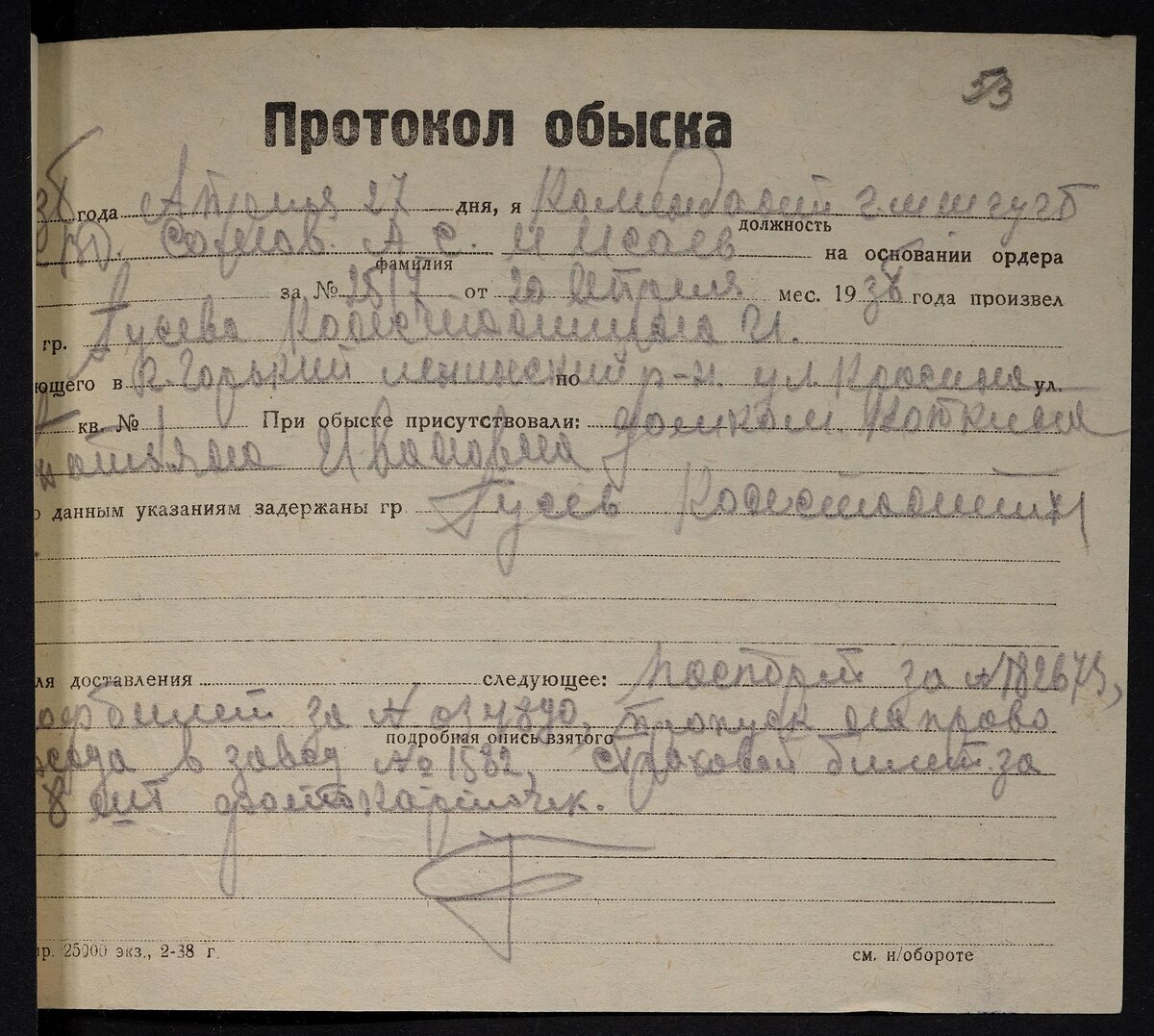 и умер в заключении, в лагере Буреполом, в 57 лет Константин Иванович Гусев родился в декабре 1884 года в Нижнем Новгороде. С женой Александрой и пятью дочками проживал в собственном доме в поселке Володарском. Работал мастером отдела технического контроля монтажной секции завода № 96. В 1902 году вступил в социал-демократическую рабочую партию (меньшевиков). За политические симпатии своей молодости Константин Иванович поплатился 35 лет спустя. В 1937 году его арестовали и приговорили к отбыванию наказания в исправительно-трудовом лагере. Мы нашли следственное дело в несколько сотен листов, в котором хранятся допросы Константина Ивановича, анкеты, очные ставки с товарищами по партии, ордеры на обыск. В следственном деле сказано, что прадед заказчицы «с 1917 по 1924 год открыто проводил антисоветскую пропаганду среди рабочих, принимал активное участие в издании и распространении нелегальной антисоветской меньшевистской литературы. В 1924 году вошел в состав подпольной меньшевистской гр