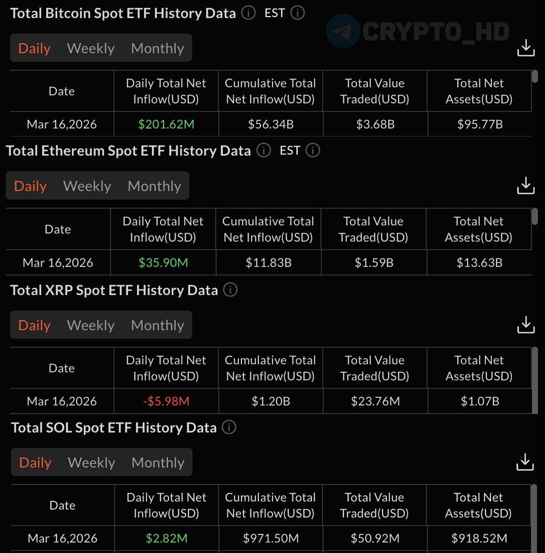 ) Финпотоки за вчерашний день: ▫️#BTC = +$201,620,000 (6 зеленых дней подряд). ▫️#ETH = +$35,900,000 (5 зеленых дней подряд). ▫️#XRP = -$5,980,000. ▫️#SOL = +$2,820,000. ▫️#LINK = +$904,090. ▫️#AVAX = +$532,220. ▫️#LTC, #DOGE, #HBAR, #DOT= $0. Компания BlackRock сегодня перевела 567 BTC ($41,8m) и 22,657 ETH ($52,4m) на биржу Coinbase Prime – кошелек Crypto Headlines