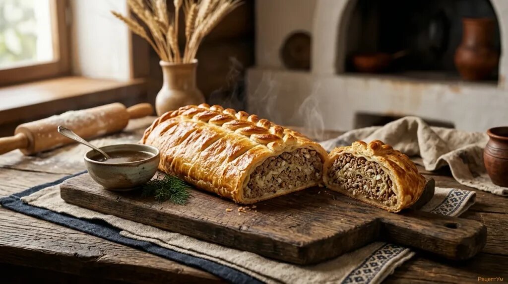 Кулебяка с мясом давно живёт в моём воскресном меню. Это не просто пирог – вытянутый, с хрустящей корочкой и щедрой начинкой из фарша, риса и яиц. Режешь – а там аромат, сочность и тепло.