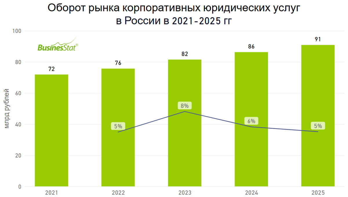 За 2021-2025 гг оборот рынка корпоративных юридических услуг в России вырос на 26%: с 72 до 91 млрд рублей.