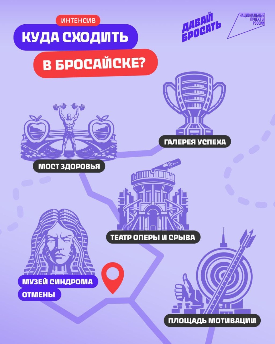 Следующая остановка — самый загадочный Музей синдрома отмены. Здесь хранятся экспонаты всех его симптомов. Давай их осмотрим 🔎 У входа нас встречает скульптура Бессонницы и усталости — частые спутники первых дней без никотина. Дальше — гравюра чувства голода, тот самый бешеный аппетит, который накрывает многих. Слева статуэтка, символизирующая головную боль и головокружение. А справа — экспонат, посвящённый раздражительности и тревожности. Когда бросаешь, часто кажется, что ты сам не свой. Хорошая новость: всё это проходит. Главное — пережить первые дни. А чтобы справляться было легче, мы возьмём на память сувениры-советы. Ищи их на карточке! Какой точно забрал бы с собой? Пиши в комментариях 👇 #бросаем_играя