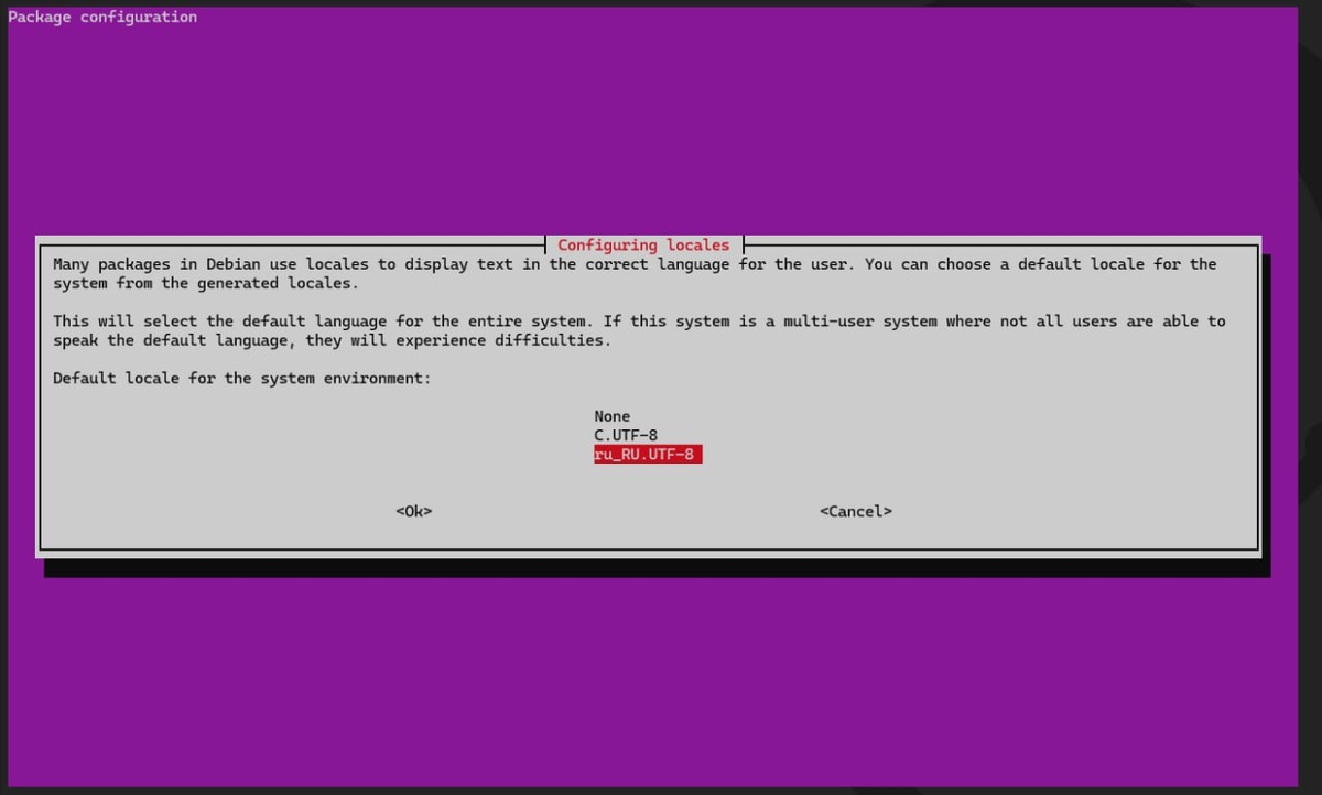 Данный вопрос достаточно простой, но очень часто про него забывают, вспоминая только тогда, когда это выходит боком. Поэтому лучше сразу уделить внимание этому вопросу и выполнить такую настройку первым делом после установки системы. Начнем с правильной установки локали, так как именно от нее могут зависеть настройки по умолчанию устанавливаемого ПО и в некоторых случаях их уже не удастся поменять просто и безболезненно. Для этого выполните команду: dpkg-reconfigure locales Перед вами появится большой список локалей – выбираем из них необходимые, обычно достаточно выбрать ru_RU.UTF-8, в некоторых случаях может понадобиться еще en_US.UTF-8, следующим шагом укажите выбранную консоль для использования по умолчанию. После чего система сгенерирует указанные вами локали и установит выбранную локалью по умолчанию. Теперь настроим консоль, это необходимо для нормального отображения символов в оболочке: dpkg-reconfigure console-setup В Debian пакета console-setup может не оказаться, в т