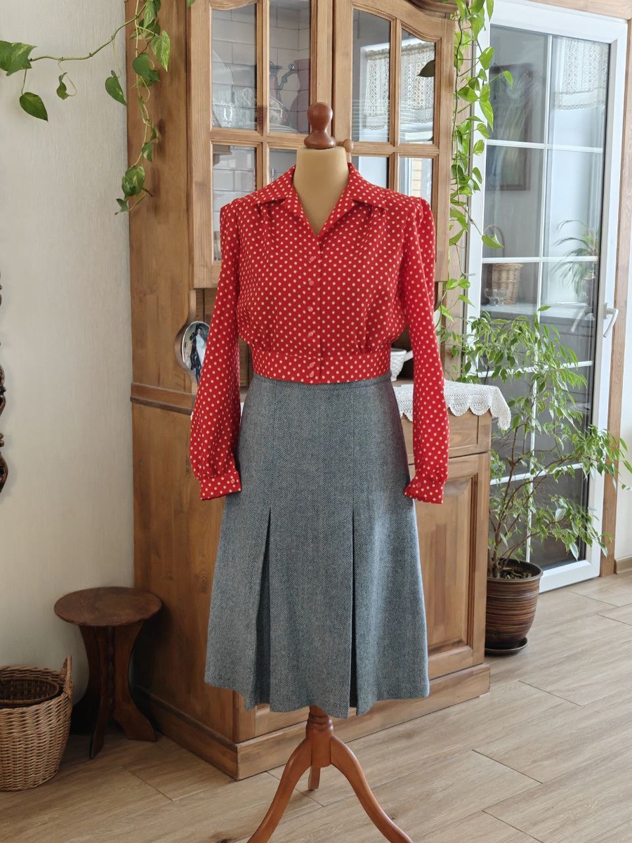 🌷🌿 Блузка в горох готова! Примерила её на манекене с серой шерстяной юбкой. Совсем скоро покажу готовый образ 😊✨ У кого плохо грузится, переходите в мою группу Вконтакте 🥰 #винтажныйстиль #ретро#мода