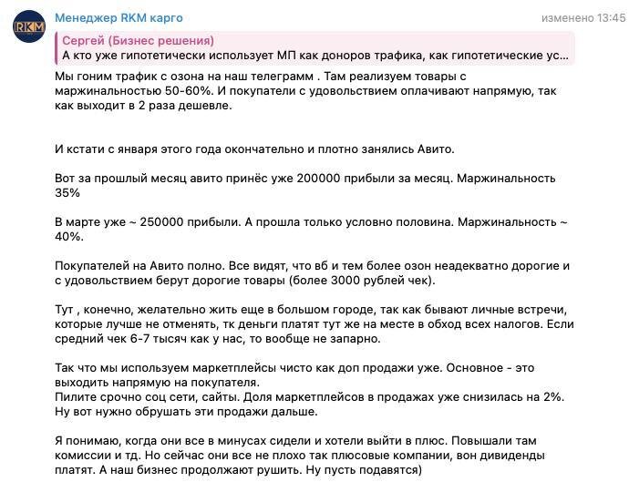 Всё чаще в чатах вижу подобные сообщения. Это уже не единичные кейсы — это тренд. «Мы гоним трафик с озона на наш телеграмм. Там реализуем товары с маржинальностью 50–60%. И покупатели с удовольствием оплачивают напрямую, так как выходит в 2 раза дешевле. И кстати с января этого года окончательно и плотно занялись Авито. Вот за прошлый месяц авито принес уже 200000 прибыли за месяц. Маржинальность 35% В марте уже ~ 250000 прибыли. А прошла только условно половина. Маржинальность ~ 40%. Покупателей на Авито полно. Все видят, что wb и тем более озон неадекватно дорогие и с удовольствием берут дорогие товары (более 30000 рублей чек). Тут , конечно, желательно жить еще в большом городе, так как бывают личные встречи, которые лучше не отменять, тк деньги платят тут же на месте в обход всех налогов. Если средний чек 6-7 тысяч как у нас, то вообще не запарно. Так что мы используем маркетплейсы чисто как доп канал продаж уже. Основное - это выходить напрямую на покупателя. Пилите срочн