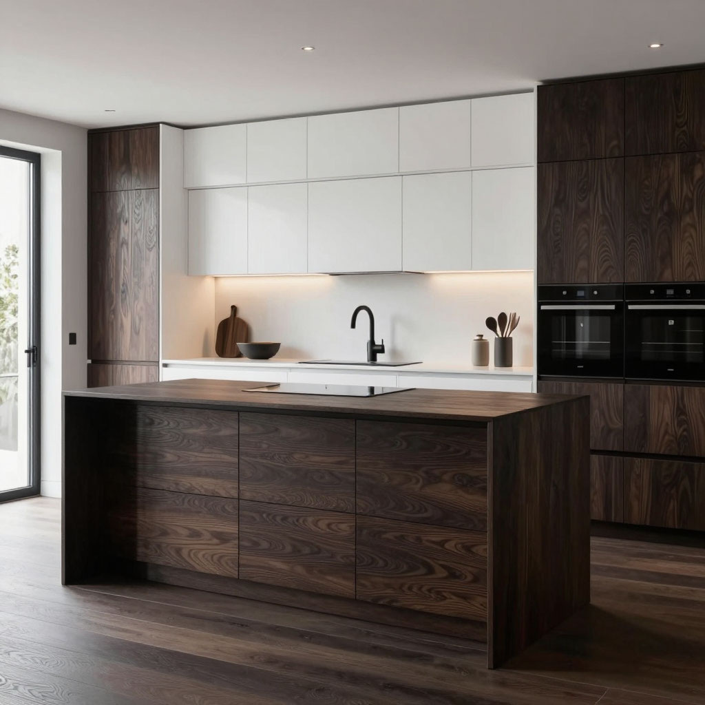 - · Минимализм с элементами дзен: Используется одна порода дерева по всему гарнитуру, часто с ярко выраженной текстурой, но без ручек (системы открывания push-to-open).