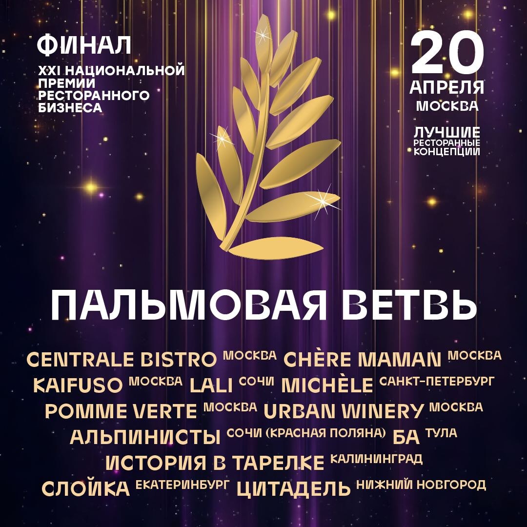 : Centrale Bistro, Москва Chère Maman, Москва Kaifuso, Москва Lali, Сочи Michèle, Санкт-Петербург Pomme Verte, Москва Urban Winery, Москва Альпинисты, Сочи, Красная Поляна Ба, Тула История в тарелке, Калининград Слойка, Екатеринбург Цитадель, Нижний Новгород Раздача слонов пальмовых ветвей – золотой, серебряной и бронзовой – победителям состоится 20 апреля в Москве. У меня есть фавориты (есть и совсем не фавориты), посмотрим. Все подробности – на palmafest.ru 👋«Соль» в ВК и в MAX 🧂 @saltmagazine