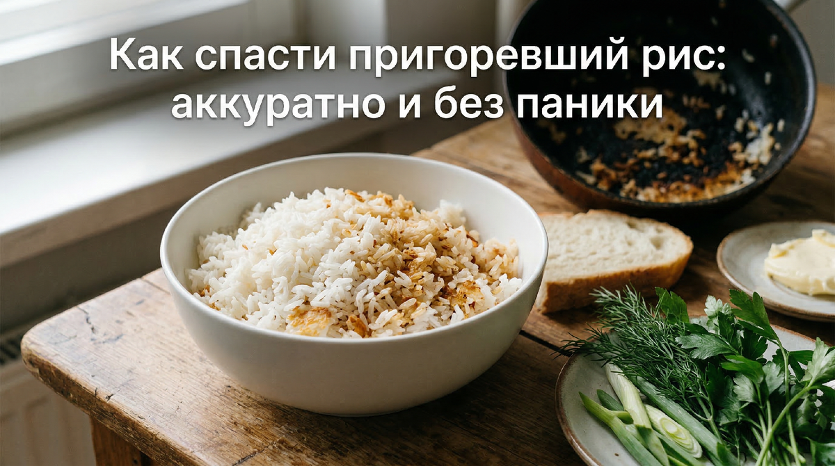 Если рис подгорел — не мешайте его. Снимите с огня, возьмите чистую посуду, аккуратно переложите верхний неповреждённый слой, оставив подгоревшее на дне. Дайте рису постоять под крышкой, попробуйте на вкус. Если есть лёгкий привкус — используйте хлебную корочку, масло, зелень или пустите рис в другое блюдо. Кастрюлю замочите с содой и не переживайте: она тоже отмоется.