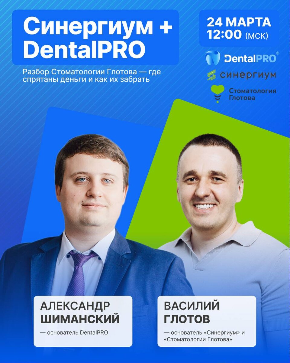 Приятно, не правда ли? ☺️ А что если мы скажем, что именно такая сумма спрятана в бизнес-процессах вашей клиники? Идём скорее искать! 🔍 Вместо карты сокровищ — вебинар «Синергиум + DentalPRO: Разбор Стоматологии Глотова — где спрятаны деньги и как их забрать». Смотрим реальные данные клиники и находим процессы, изменив которые уже завтра можно увеличить финансовый результат 🔥 В эфире: 🦷 Александр Шиманский — основатель МИС DentalPRO. 💚 Василий Глотов — основатель «Синергиум» и «Стоматологии Глотова». 🗓 24 марта — вторник ⏲ 12:00 (МСК) ⛓️💥 Зарегистрироваться на вебинар #Вебинары