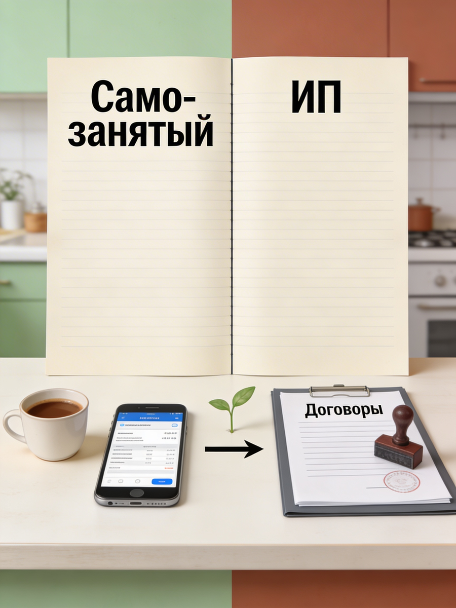 Если коротко, самозанятость — это «кухонная версия» бизнеса: минимум посуды и быстрый ужин. ИП — уже полноценная кухня с духовкой, вытяжкой и ответственностью за весь банкет. Важно не застрять в стадии «я просто принимаю переводы», когда по факту вы давно выросли.