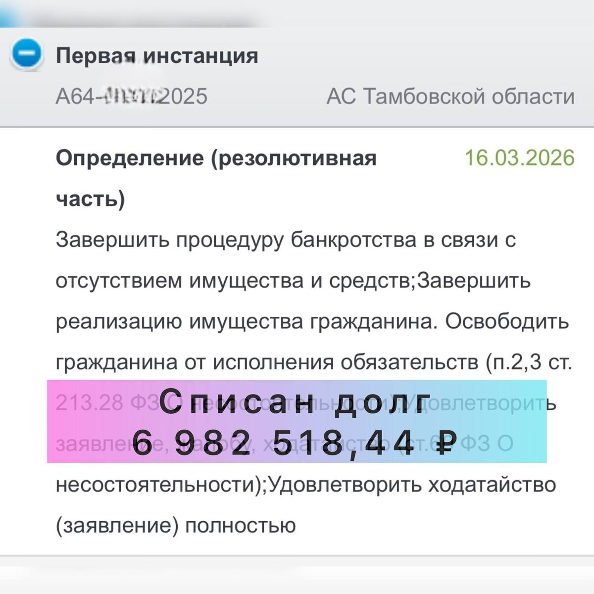 ☺️ Все закончилось отлично, как и планировали. ⠀ В прошлом посте я писала, что супругу списали более 11 миллионов. Супруге списали почти 7 млн.₽ Итого #семья обнулила: 11 858 653,77+6 982 518,44=18 841 172,21 😱 😮 🤯 Только представьте, почти 19млн долга, который теперь можно не возвращать 🥳 ⠀ Кто молодец? Правильно 👍 Доступное банкротство и Дневник юриста | Яковлева Л.И. ⠀ Дело у каждого из супругов было с нюансами, но мы с ними справились даже лучше, чем ожидалось. ⠀ Конечно я каждому клиенту желаю больше не попадать в такие ситуации, а ко мне обращаться только по хорошим вопросам. Каким❓ ✅ Сопровождение сделок ✅ Сопровождение Вашего бизнеса ✅ Разработка документов, соглашений, договоров ✅ Проверка контрагентов и партнеров и это не исчерпывающий список ⠀ А пока, поздравляю моих клиентов🌺 Они тоже молодцы, выдержали всё стойко и без нервов. 🤝 ————————— ©️Яковлева Л.И., 17.03.2026г. ⠀ ☎️ 8-800-201-43-41 (звонок бесплатный) 📞 8-910-857-67-70 ————————— #дневникюриста #ЦентрБухгалт