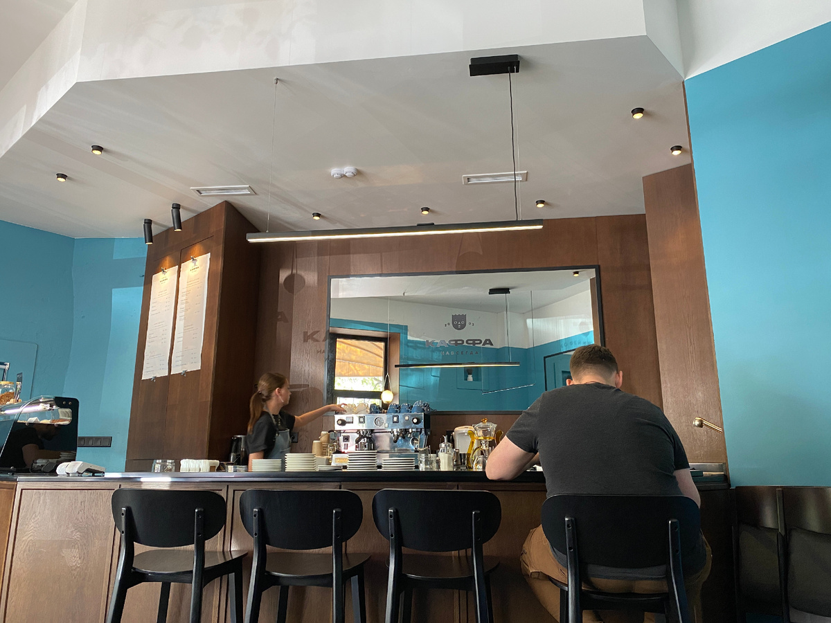 Из переделанной в цифровой проигрыватель «Ригонды» играет ню-джаз. Бариста Тася делает за стойкой кофе навынос. Стены «Каффы» просто выкрашены синим. Мебель — в спокойных коричневых тонах. Барная стойка лаконична. Диван, на котором я сижу, и комод у двери, где стоят пакеты с зерновым кофе, — местной дизайнерской марки Valkeda.