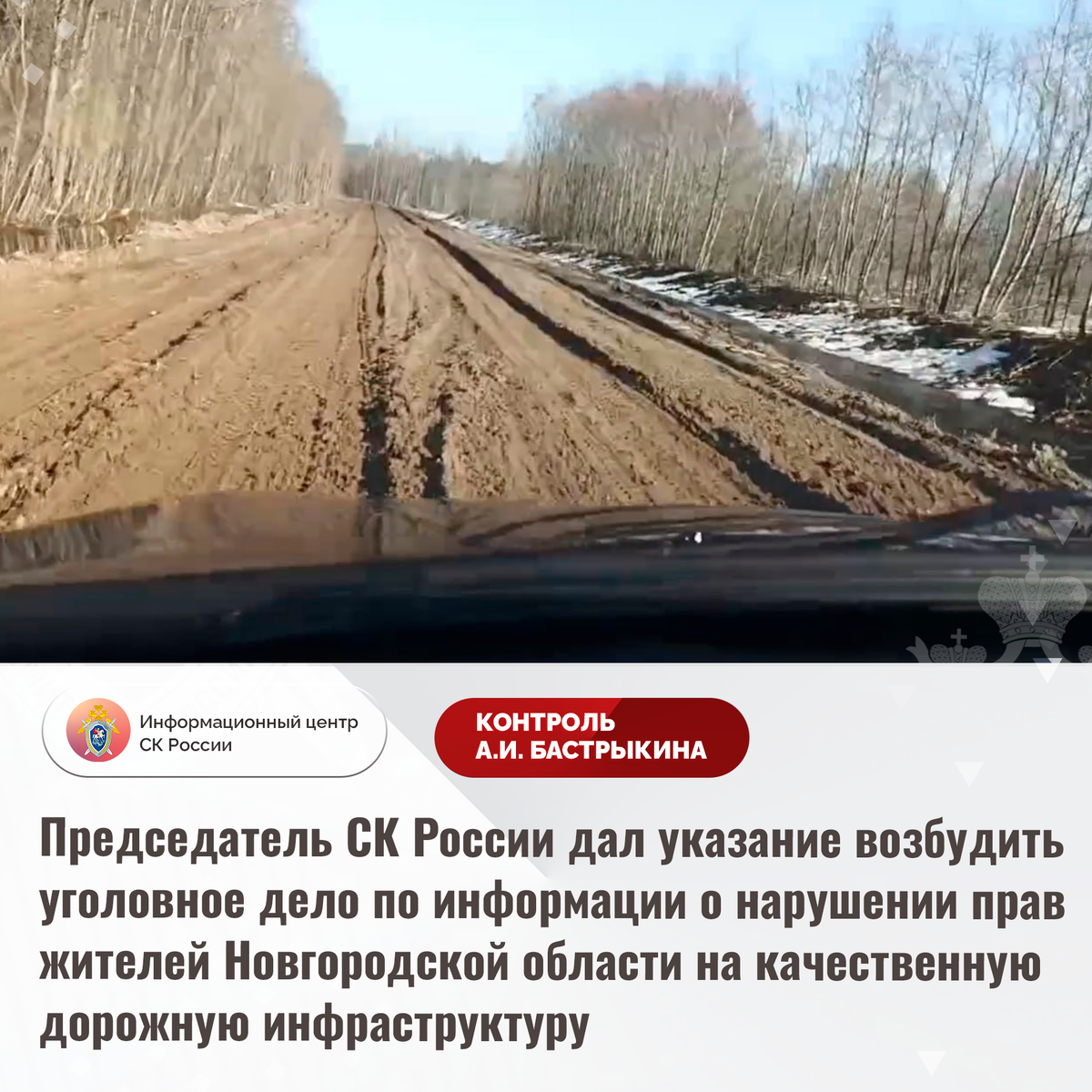 Председатель СК России дал указание возбудить уголовное дело по информации о нарушении прав жителей Новгородской области на качественную дорожную инфраструктуру В социальной сети сообщается о нарушении прав жителей деревень Малое Замошье и Большое Замошье Новгородской области на качественную дорожную инфраструктуру. Длительное время автомобильная дорога находится в непригодном состоянии: асфальтовое покрытие отсутствует, на поверхности образовались многочисленные колеи. В результате проезд по ней транспортных средств, в том числе спецтранспорта, затруднен. Несмотря на имеющиеся нарушения, мер к их устранению не принимается. В СУ СК России по Новгородской области по данному факту организована процессуальная проверка. Председатель Следственного комитета Российской Федерации Александр Иванович Бастрыкин дал указание руководителю СУ СК России по Новгородской области Николаю Николаевичу Супруну возбудить уголовное дело и представить доклад о предварительных и окончательных результатах его