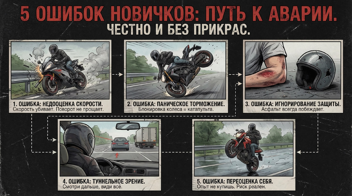 Каждый сезон на дороги выезжают новички. У кого-то первый мотоцикл, у кого-то “сбылась мечта”. Но статистика остаётся жёсткой: большинство аварий — это не «невезение», а ошибки. Причём одни и те же. Без романтики. Только то, как есть. Первые дни — аккуратность. Потом приходит ощущение: «я уже умею».
