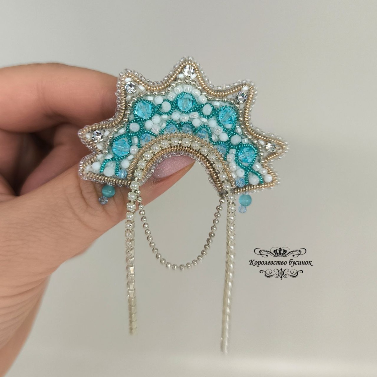". В работе использованы кристаллы мэш Сваровски, бисер чешский и японский, жемчужная стразовая лента и цепочка из шариков. Обратная сторона натуральная кожа и япон, кая булавочка. Размер 5мм х 3,5см без учёта свисающих деталей. Стоимость 2 500 руб. + доставка. #брошь #кокошник #кокошниквтренде #ручнаяработа #брошьизбисера #русскийстиль #кокошник #брошка #брошь #царица