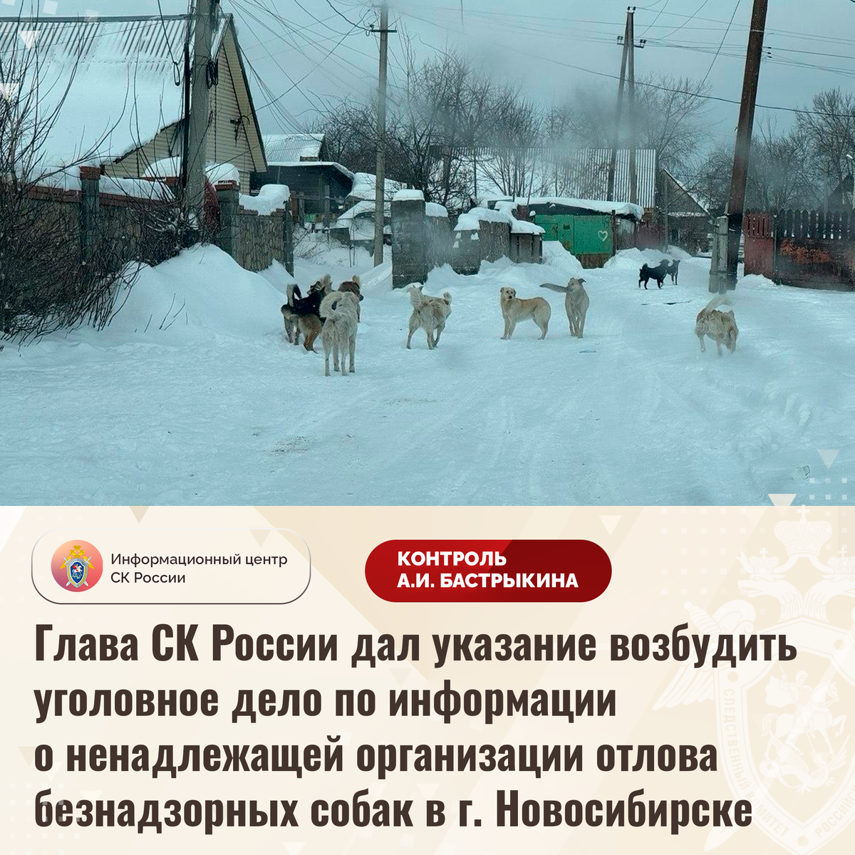 Глава СК России дал указание возбудить уголовное дело по информации о ненадлежащей организации отлова безнадзорных собак в г. Новосибирске В социальных сетях сообщается о ненадлежащей организации отлова безнадзорных собак в микрорайоне Лесоперевалка города Новосибирска. На протяжении десяти лет вблизи жилых домов обитает большое количество животных без владельцев, которые проявляют агрессию в отношении граждан, в том числе детей. Многочисленные обращения в различные инстанции результатов не принесли. В СУ СК России по Новосибирской области организована процессуальная проверка. Председатель Следственного комитета Российской Федерации Александр Иванович Бастрыкин дал указание и.о. руководителя СУ СК России по Новосибирской области Сергею Александровичу Артеменко возбудить уголовное дело и представить доклад о ходе и результатах его расследования с учетом озвученных в публичном пространстве доводов. Исполнение поручения поставлено на контроль в центральном аппарате ведомства. #Следственн