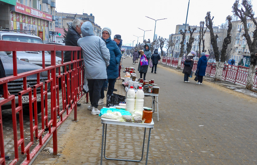 В Камышине из-за холода продавцы поднялись с земли на стихийном рынке на улице Ленина. Но своих "позиций" на тротуаре не "сдали".