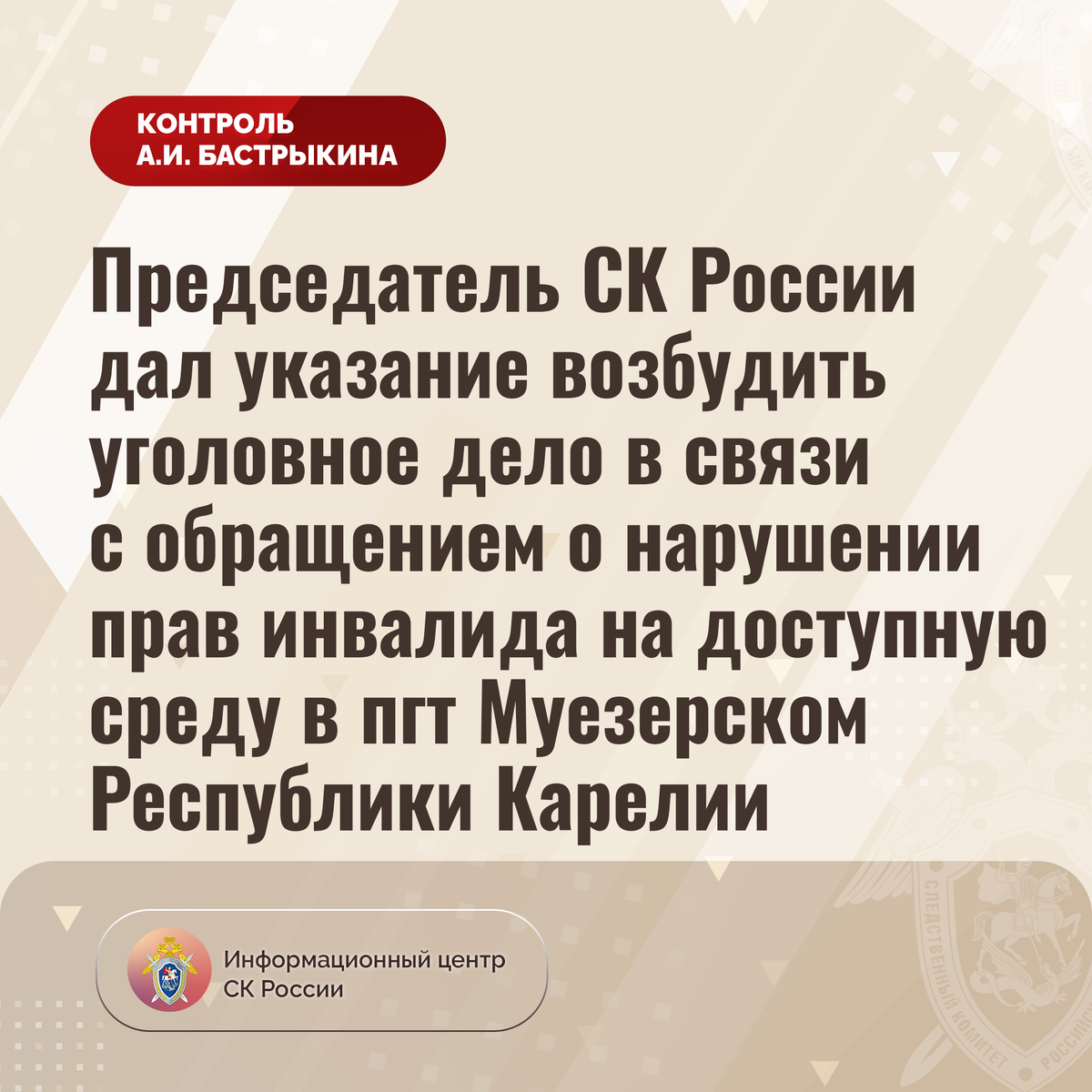 Председатель СК России дал указание возбудить уголовное дело в связи с обращением о нарушении прав инвалида на доступную среду в пгт Муезерском Республики Карелии В адрес Председателя СК России А.И. Бастрыкина через его приёмную «ВКонтакте» поступило обращение по вопросу нарушения прав инвалида-колясочника из Республики Карелии на доступную среду. Мужчина проживает на втором этаже многоквартирного дома в поселке городского типа Муезерский, в котором отсутствует лифт, лестничные марши не оборудованы пандусом. В результате он лишен возможности без посторонней помощи покинуть жилище. Обращения в различные инстанции результатов не принесли. В СУ СК России по Республике Карелия организована процессуальная проверка. Председатель Следственного комитета Российской Федерации Александр Иванович Бастрыкин дал указание руководителю СУ СК России по Республике Карелии Максиму Сергеевичу Козлову возбудить уголовное дело и представить доклад о ходе и результатах его расследования. Исполнение поручени