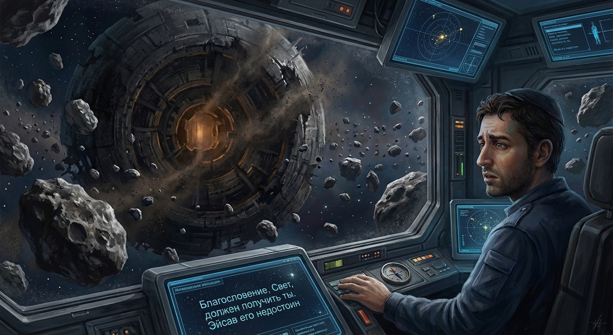 Корабль «Простота» висел в поясе астероидов Системы Ицхак, как затаившийся хищник. Сквозь иллюминатор командного отсека Яаков смотрел на гигантскую, слепую станцию «Олам а-Зэ». Ее датчики давно вышли из строя, погрузив ее в вечную тьму, но внутри все еще теплилась энергия, способная перезапустить цивилизацию — Свет Исправления, «Гмар Тиккун». Яаков сглотнул ком в горле. Он был штурманом-навигатором, человеком с «простой» душой, как говорил о нем его наставник. Его внутренний компас всегда указывал на истину. Для него не существовало полутонов, только «правда» и «ложь». А сейчас ему предстояло войти туда и солгать. Перехваченное сообщение Матриарха Ривки горело в его мозгу, как раскаленная игла: «Благословение, Свет, должен получить ты. Эйсав его недостоин». Его брат, Эйсав, командовал флотилией «Эдом» — ордой мародеров, что видели в Свете лишь оружие. Если Свет достанется ему, тьма поглотит галактику навсегда. Но как украсть? Как обмануть Ицхака, хранителя станции, который по голосу пр