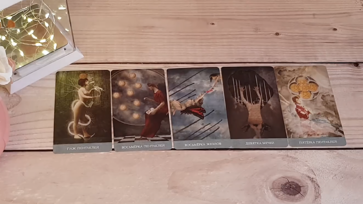 Теперь — ваши отношения. Что вас связывает? Башня — разрушение. Луна — обман. Повешенный — вас сделали жертвой. Четвёрка Мечей — вы долго приходите в себя после этого разрушения. Почему разрушение? Из-за обмана, связанного с финансами. Этот мужчина — либо плут, либо альфонс. Возможно, вы жили с ним много лет, он был вашим мужем, но всё это время ехал на вашем горбу. Он зарабатывал мало, обещал: «Скоро, скоро!» — но «скоро» так и не наступило. Вы оказались в роли жертвы, и уход его был резким, стремительным, с обманом. Возможно, он даже обворовал вас, обобрал. Для него финансы — главное в жизни. Жизнь у него никчёмная, бездуховная, но интересная, потому что он идёт навстречу Пентаклям.