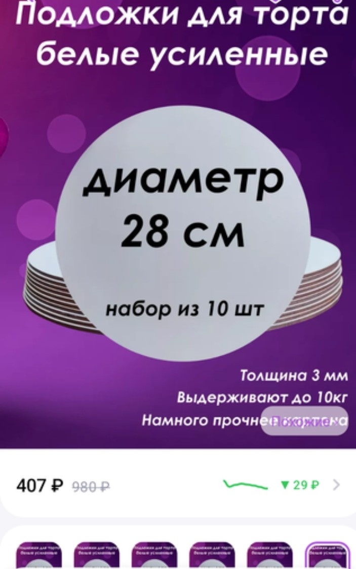 Заказала подложки усиленные для тортов. Из такого материала я уже заказывала и осталась очень довольна. Только они были квадратные и круглых у проверенного продавца не оказалось. Поэтому я пошерстила и нашла вот эти: