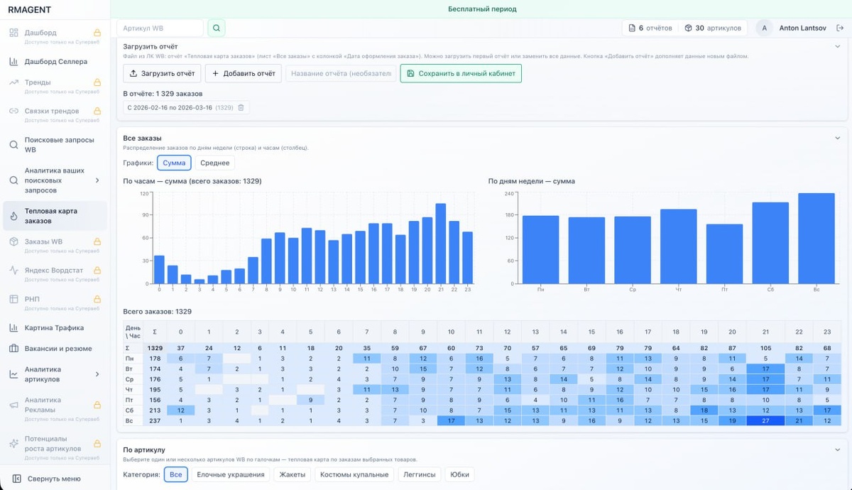 На rmagent.ru появился бесплатный инструмент для создания тепловой карты заказов по дням и часам. Загружаете данные из Ленты заказов — получаете визуализацию по категориям, артикулам, группам и даже размерной сетке. Почему это важно: • Позволяет выявлять пики и спады заказов по времени, что критично для планирования работы склада и службы поддержки. • Упрощает анализ эффективности товаров и категорий — сразу видно, что продается и когда. • Помогает оптимизировать логистику и график работы, особенно если вы работаете с несколькими маркетплейсами. Гипотезы: • Инструмент может быть особенно полезен для селлеров с большим ассортиментом — тепловая карта наглядно покажет, где сосредоточены основные продажи. • Анализ по размерной сетке может стать ключевым для fashion-сегмента, помогая точнее формировать заказы у поставщиков. • Тепловые карты могут помочь в планировании рекламных кампаний и акций, синхронизируя их с пиками спроса. Что делать селлеру: 1. Протестируйте инструмент на реальных да