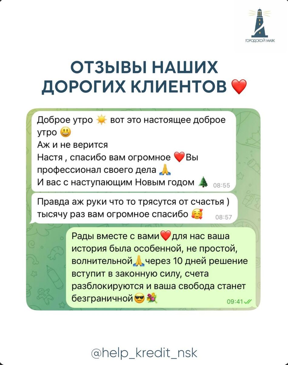 или решение вопросов с долгами. Именно для этого мы и работаем 🤝 Мы помогаем клиентам в разных финансовых ситуациях и подбираем решения, исходя из их целей и возможностей. Что мы можем для вас сделать: 💳 Помочь получить кредит или ипотеку Подберём оптимальные предложения банков, увеличим шансы на одобрение и постараемся снизить процентную ставку. 🔄 Рефинансировать кредиты Если у вас уже есть займы — поможем уменьшить процент и снизить ежемесячную нагрузку. ⚖ Поддержка в сложных ситуациях Оказываем юридическую помощь, в том числе при прохождении процедуры банкротства. 🏠 Покупка и продажа недвижимости Подберём подходящий вариант, проверим документы и полностью сопроводим сделку. Наша задача — сэкономить ваше время, деньги и нервы, а также найти решение даже в непростых ситуациях ☝🏽 За время работы нам доверились сотни клиентов. Многие из них возвращаются к нам снова и рекомендуют нас своим знакомым (кстати, у нас есть бонусы за рекомендации) ❤️ А лучше всего о нашей работе
