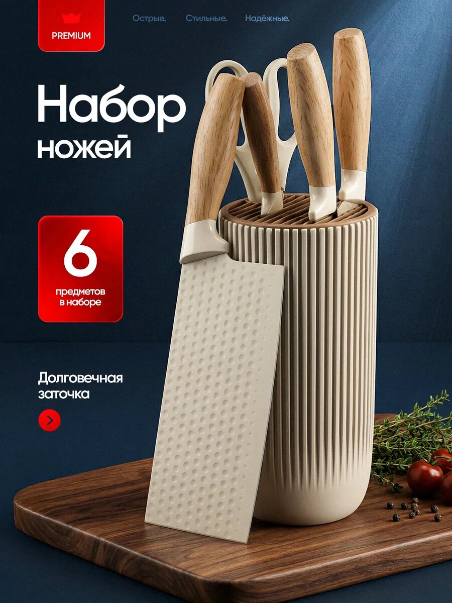 Набор из 6 предметов с подставкой — нож-топорик, поварской нож, нож для нарезки, универсальный нож, кухонные ножницы и подставка. Лезвия с улучшенным антипригарным покрытием, защищают от ржавчины и прилипания пищи. Тщательно отполированы для максимальной остроты.