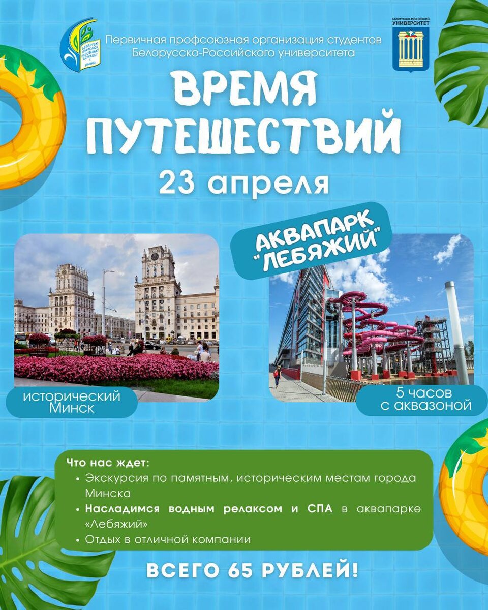 ! 📅23 апреля профком студентов Белорусско‑Российского университета организует большую поездку в Минск — отличную возможность сменить обстановку, увидеть столицу и провести день ярко и активно. ⚡️Что вас ждет? 🔘Прогулка по Минску с посещением знаковых исторических и культурных мест города. 🔘Аквапарк «Лебяжий» — целых пять часов отдыха: водные горки, бассейны, аттракционы и уютная банная зона для полного релакса. ➡️Стоимость поездки для членов профсоюза — 65 рублей. Количество мест ограничено, поэтому лучше не откладывать решение. 🖥 Подписывайся на наши соцсети: 💬 VK / 📹YouTube / 📺RuTube / 📱 Instagram / 📱 TikTok