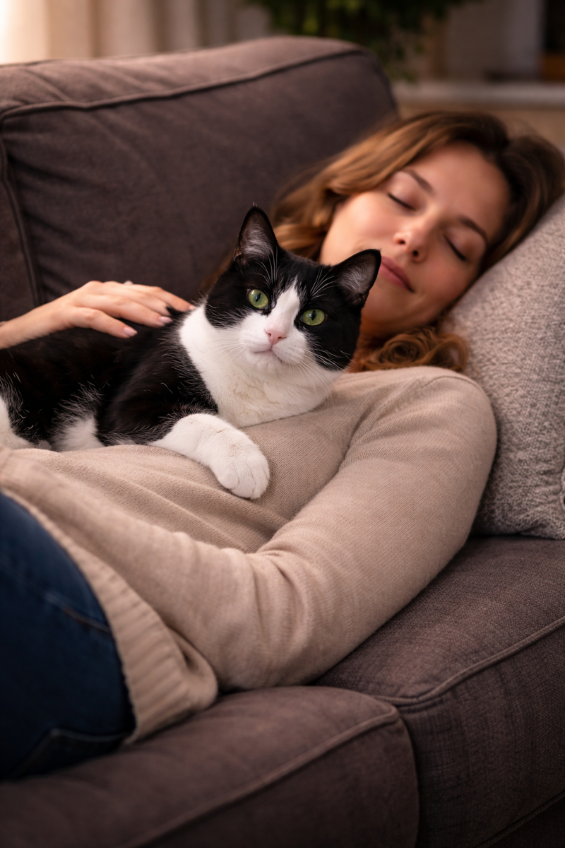 Вы лежите, отдыхаете после дня. Кошка подходит ближе. Аккуратно устраивается прямо на груди. Сворачивается, устраивается поудобнее - и начинает мурлыкать. И в этот момент появляется ощущение: она выбрала это место не случайно. Будто в этом есть какой-то особый смысл. Почему это кажется таким особенным Если понаблюдать внимательнее, можно заметить детали. Кошка закрывает глаза. Долго не уходит. Иногда засыпает прямо на человеке. И невольно возникает вопрос: Почему именно грудь, а не колени или место рядом? На самом деле у такого поведения есть сразу несколько причин - и все они довольно понятные. Причина №1 - тепло Грудь - одно из самых тёплых мест на теле человека. Для кошки это важно. Они любят: стабильное тепло мягкую поверхность ощущение уюта Поэтому такое место буквально "идеально" с точки зрения комфорта. Причина №2 - звук сердца Это одна из самых сильных причин, хотя о ней редко задумываются. Кошка слышит: биение сердца ритм дыхания Для неё это знакомый и успокаивающий фон. Он
