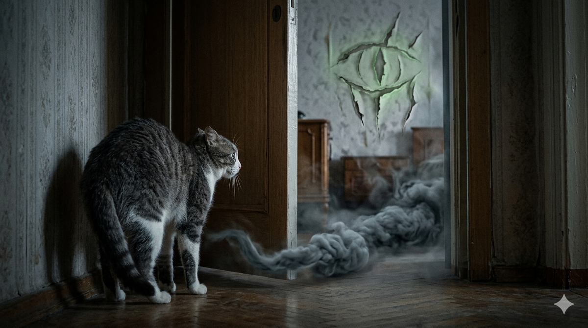 Барсик издал звук, который я никогда не забуду: тонкий, вибрирующий хрип. Кот пополз назад, не сводя глаз с узкой щели под дверью. И тут я заметил: из-под двери начал сочиться дым. Нет, это был не дым — густой, тяжелый серый туман, который не поднимался вверх, а стелился по полу, как живое существо.