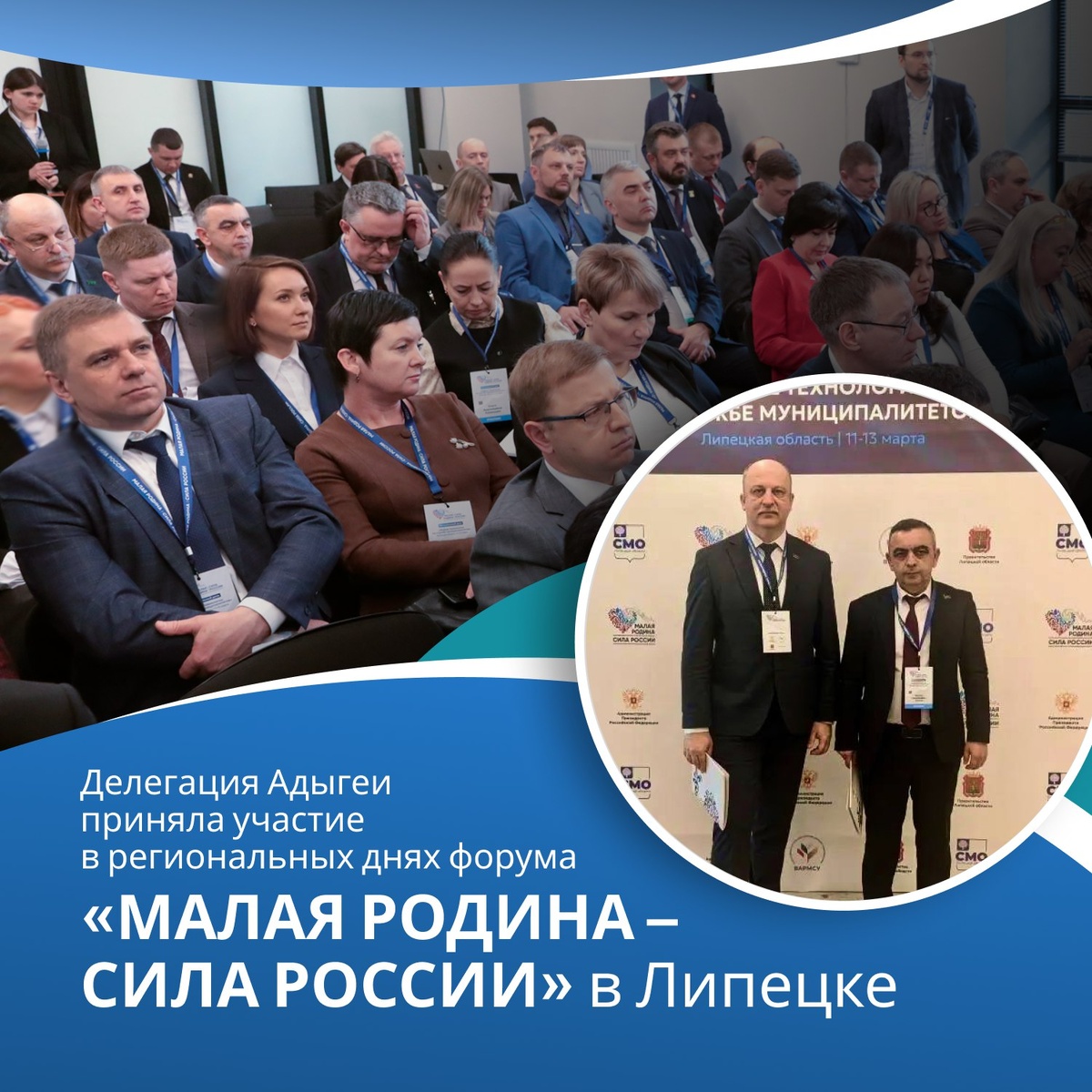 На прошлой неделе в Липецкой области прошли седьмые региональные дни III Всероссийского муниципального форума «МАЛАЯ РОДИНА – СИЛА РОССИИ». Тема площадки — «Новые технологии на службе муниципалитета». Мероприятие объединило порядка 500 участников: представителей муниципалитетов, федеральных и региональных органов власти, Совета Федерации, Госдумы и общественных организаций. Нашу республику на форуме представили главы администраций Шовгеновского района Рашид Аутлев и Гиагинского района - Андрей Таранухин. С приветствием ко всем участникам форума обратился замначальника управления президента РФ по внутренней политике Евгений Грачев. Он подчеркнул необходимость работы на опережение, важность грамотного применения инноваций и сохранения человеческого участия. Сопредседатель ВАРМСУ Ирина Гусева подчеркнула, что в центре любых решений всегда остается человек.