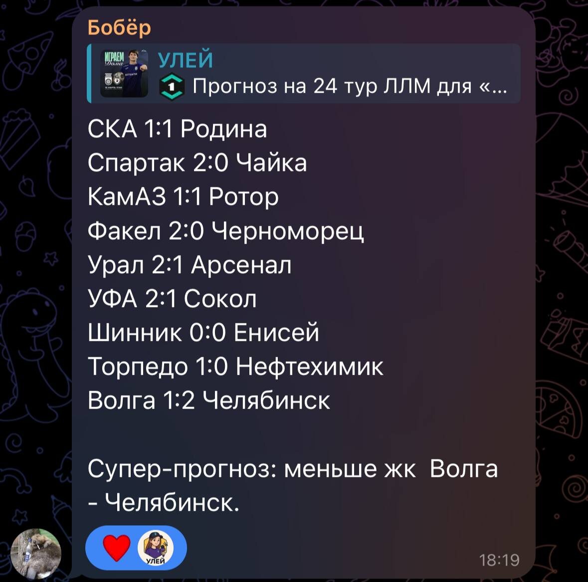 🦫 Наш бобёр наконец-то вышел из зимней спячки и заработал 11 баллов на прогнозах Это лучший результат среди моих подписчиков в прошедшем туре. Приглашаю грызуна сделать прогнозы от УЛЬЯ на следующие матчи 🤝