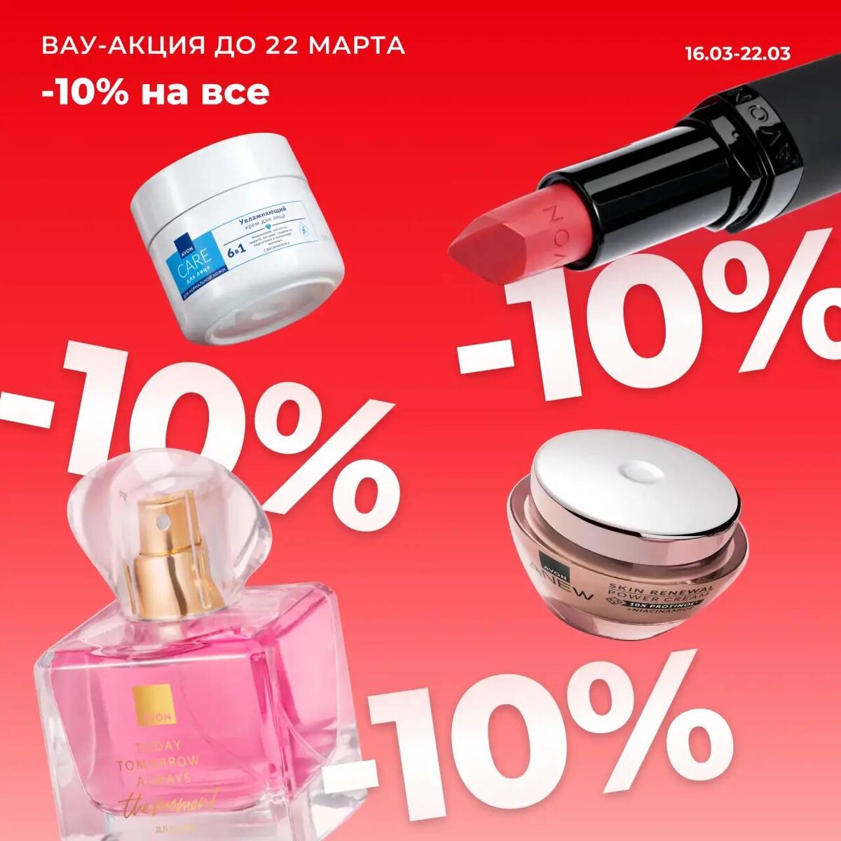 🎊 Запускаем неделю супервыгоды: с 16 по 22 марта абсолютно весь ассортимент доступен к заказу со скидкой 10% и в приложении, и на сайте! 👉 Скидка применяется в корзине следующим образом: сначала 10%, затем дифференцированная скидка Покупателя с привилегиями*, если заказ на сумму 1500Р и выше. Если заказ на сумму менее 1500Р, то применится ТОЛЬКО скидка 10%. Делись с командой и используй вау-акцию, чтобы приглашать новичков в Avon! *Скидка Покупателя с привилегиями применяется на все товары, кроме товаров с фиксированной скидкой. Цены на продукты входят в базу для расчета скидки.