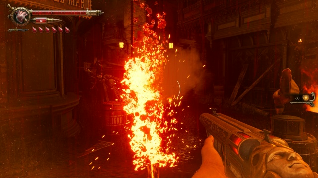 Главная фишка игры – оружие Габриэля, которое питается его кровью. Шкала крови тут играет роль как шкалы здоровья, так и источника зарядов, поэтому порой приходится выбирать, зарядить ли пушку помощнее, но сжирающую много крови, или довольствоваться полудохлым пистолетиком, но не доводить себя до обескровливания. Видов огнестрельного оружия тут всего пять, зато их можно прокачивать за счёт найденных денег.