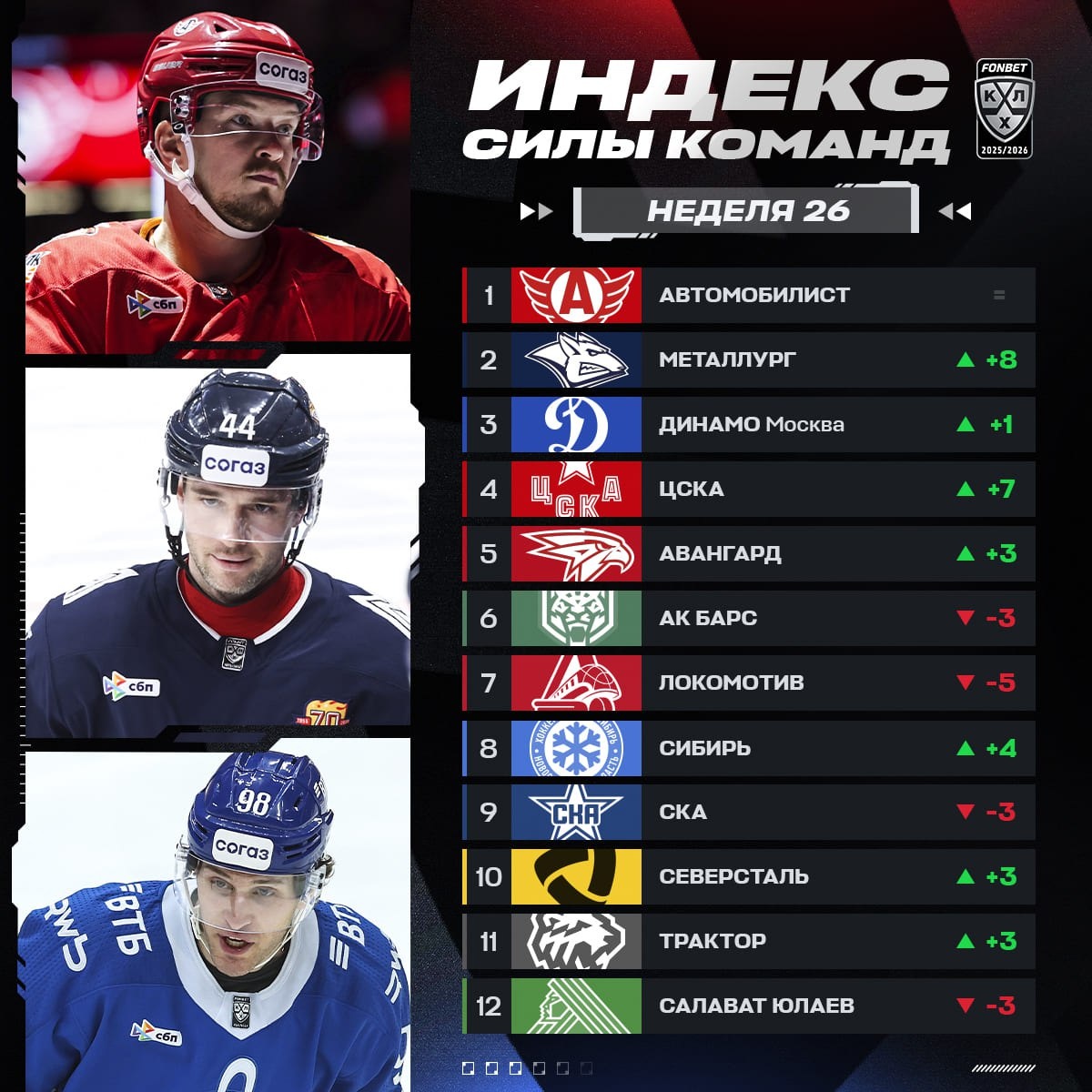 «Металлург» и московское «Динамо» присоединились к «Автомобилисту» в тройке лидеров нового Индекса силы команд.