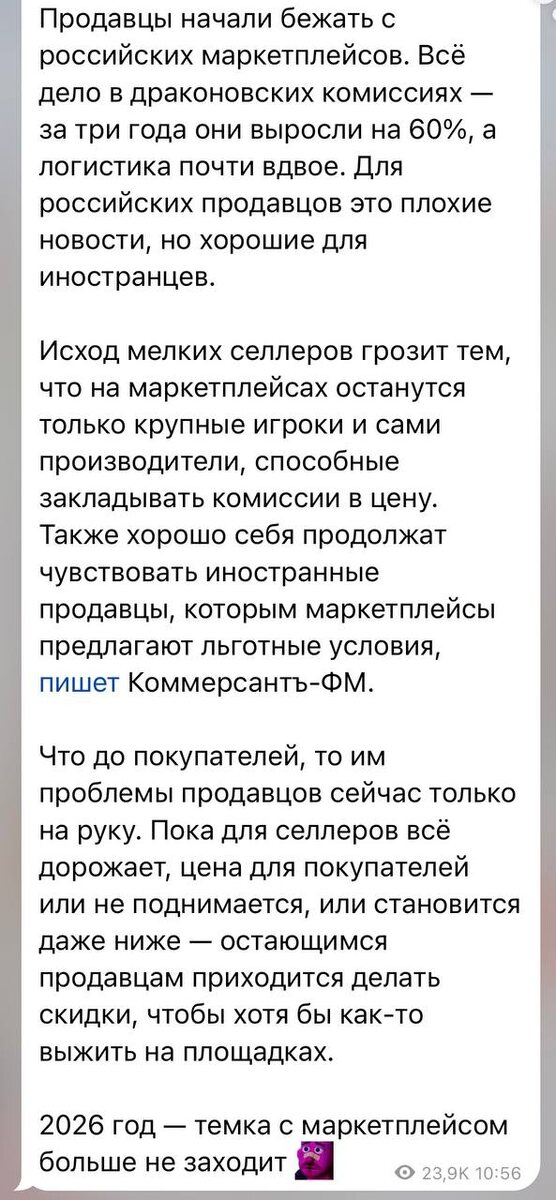 Сейчас многие обсуждают новости про то, что селлеры уходят с маркетплейсов и банкротятся. Да, закончилось время, когда можно было купить что-то на рынке в Китае и перепродать дороже. За последние годы сильно выросли комиссии маркетплейсов, выросли налоги, увеличилась конкуренция и зарабатывать стало значительно сложнее. Поэтому сейчас время брендов и время продуктов. Фокус нужно делать на продукте, на построении бренда, работе с аудиторией и её удержании. И те, кто к этому ещё не пришёл или не понял этого, в прошлом году и в этом году многие из них начинают банкротиться. Потому что маркетплейсам интересны крупные игроки. Это видно даже по тому, что большие компании получают индивидуальные условия. Если у тебя нет сильного продукта, своей аудитории и нет индивидуальных условий, то становится очень тяжело зарабатывать, просто покупая дешевле и продавая дороже. Всегда найдётся конкурент: ⏺у которого оборот больше, ⏺у которого комиссия ниже, ⏺у которого условия лучше. И с ним просто с