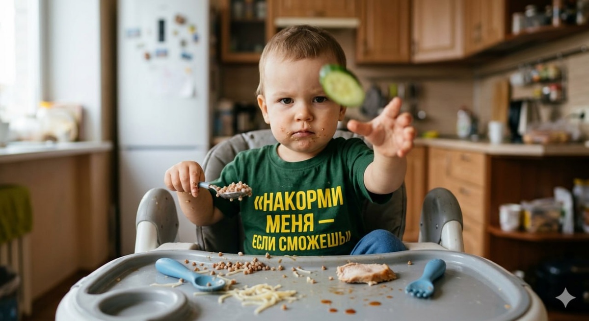 Сегодня, 17 марта - отмечается День гречневой каши! 👍Кто любит - лайк. 👎Кто не любит - дизлайк. Создай фото. **Главный объект** Ребёнок сидит в высоком стульчике для кормления, занимает центральную часть кадра — около 50% высоты изображения. Фронтальный ракурс, уровень глаз ребёнка. Внешность и черты лица полностью перенести с загруженных референс-фотографий без каких-либо изменений — сохранить форму лица, цвет и форму глаз, нос, губы, оттенок кожи, причёску (0% отклонения от оригинала). Выражение лица — уверенное, серьёзное, с вызывающим взглядом прямо в камеру. **Одежда** - Футболка тёмно-зелёного цвета с крупной ярко-жёлтой надписью на груди: «Накорми меня — если сможешь» (шрифт жирный, чёткий, хорошо читаемый) - Синие хлопковые штанишки **Действия и предметы** - В одной руке ребёнок держит гречневую кашу - Другой рукой бросает кусочек огурца прямо в камеру — огурец в полёте, направлен в сторону зрителя - На подносе стульчика лежит кусочек индейки - На подносе стоят силиконовы