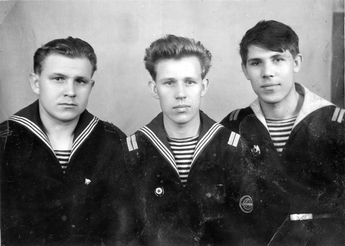 Два старшины 2 статьи и матрос Северного флота в суконных форменных рубахах и нашивных погончиках образца 1943 года