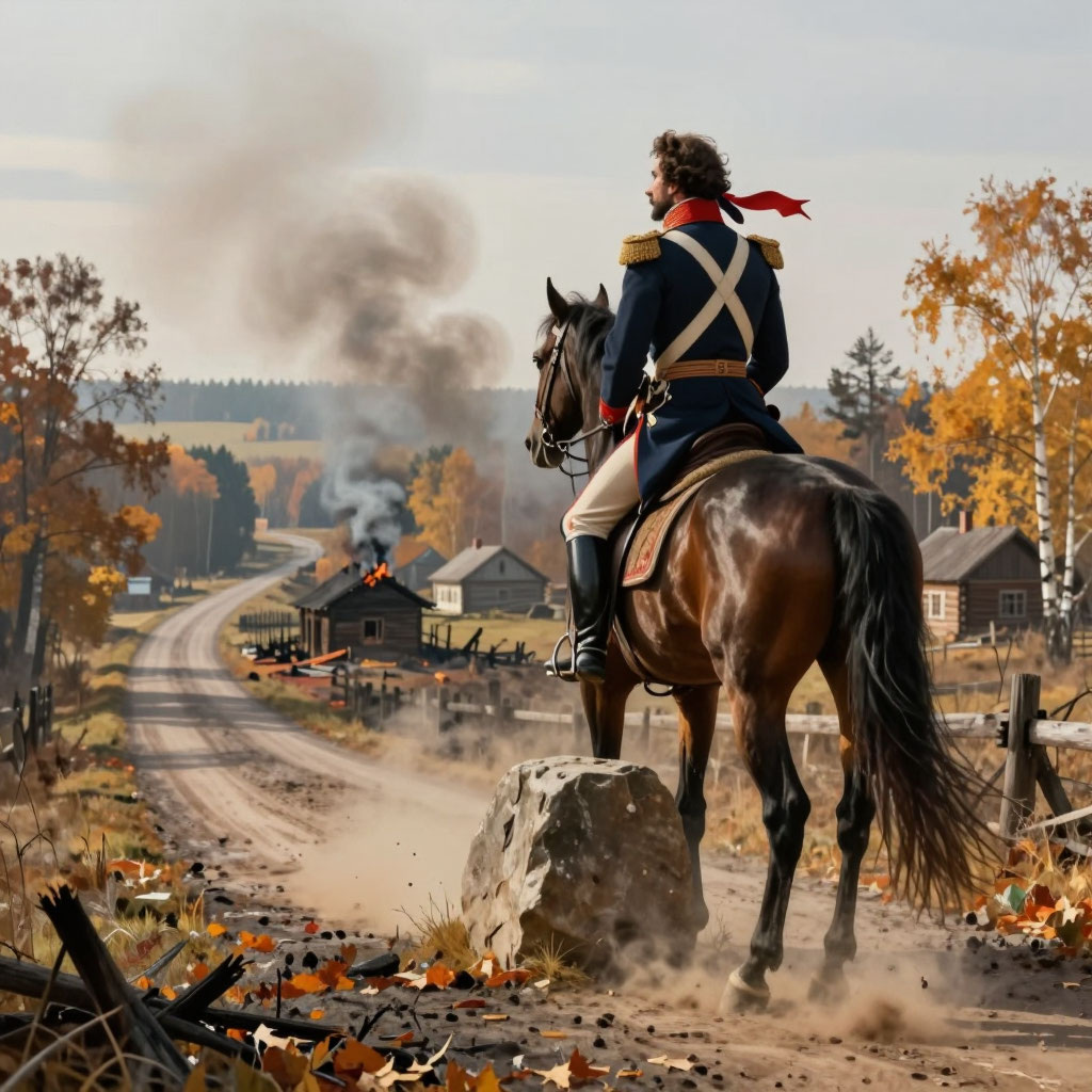 Осенний ветер гнал по дорогам пыль, смешанную с пеплом сожжённых деревень. Денис Давыдов сидел на коне, вглядываясь в даль, где смутно виднелись очертания лесов и перелесков. Мысли его были тяжелы, словно свинец: корпуса Жюно и Понятовского, хоть и слабые, встали перед ним камнем преткновения.