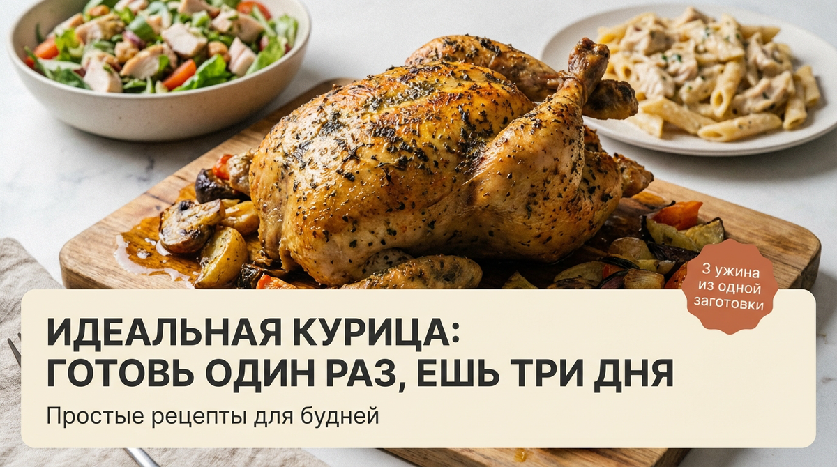 Одна запечённая курица — три ужина: сочная заготовка, быстрый салат, паста с соусом и третий вариант из остатков. Время, порции, хранение.