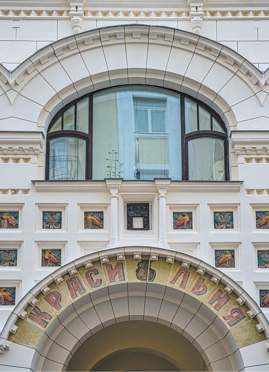 Эти две вывески были спасены летом 2024 года во время реставрации знаменитого Саввинского подворья. Тогда фасад почистили, восстановили утраты и обнаружили две прекрасные вывески начала ХХ века. Они были отреставрированы. Одна из них – «Ц.М. Молчадская» – скорее всего, москвички Ципы Моисеевны, торговавшей радиотоварами. Вторая – «Красильня». Саввино-Сторожевское подворье существовало на Тверской улице еще с XVII века, а в 1907 году здесь в неорусском стиле был построен 4-этажный доходный дом по проекту архитектора Ивана Кузнецова. Фасад облицован яркой майоликовой плиткой, выполненной по эскизам зодчего. Доходный дом подворья – обладатель сразу двух прекрасных дворов-колодцев со свободным доступом.