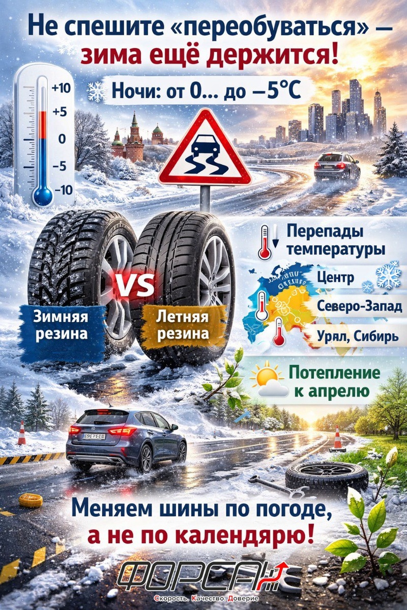 🚗❄️ Синоптики советуют жителям Москвы повременить с переходом на летние шины. По словам специалиста центра погоды «Фобос» Михаила Леуса, ночные температуры в столичном регионе остаются в диапазоне 0…–5 °C как минимум до конца недели, поэтому оптимальное время для смены резины — не раньше первой декады апреля. 📉 Что происходит сейчас: - В Москве ночью фиксируются колебания от +1,8 °C до –4,3 °C - В Новой Москве — до –5,8 °C - В Подмосковье — до –6,1 °C - Погода укладывается в климатическую норму марта ⚠️ Важный момент: даже в апреле возможны возвратные заморозки. В среднем последние минусовые температуры в Москве приходятся на конец апреля, но иногда они затягиваются до мая. 🌍 Что по другим регионам? Похожая ситуация наблюдается и в ряде других областей: - Северо-Запад (Санкт-Петербург, Ленобласть) — ночные «минусы» держатся стабильно, смену шин откладывают до середины апреля - Центральная Россия (Тверь, Ярославль, Владимир) — температурные качели: днём плюс, ночью минус → риск го