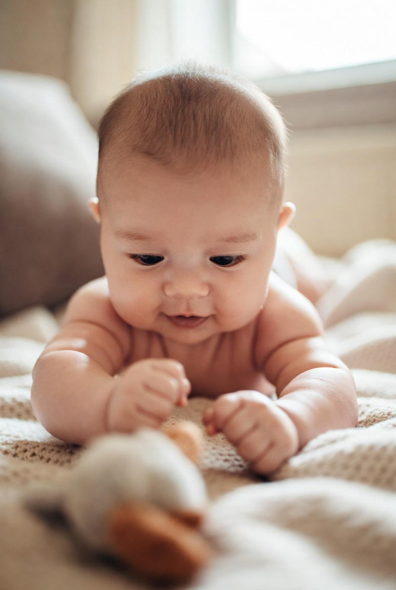 ✅ Создайте интерес. Лягте рядом с малышом на одном уровне. Покажите ему игрушки или даже бытовые предметы (безопасные тапки, пульт), которые реально привлекают внимание.
