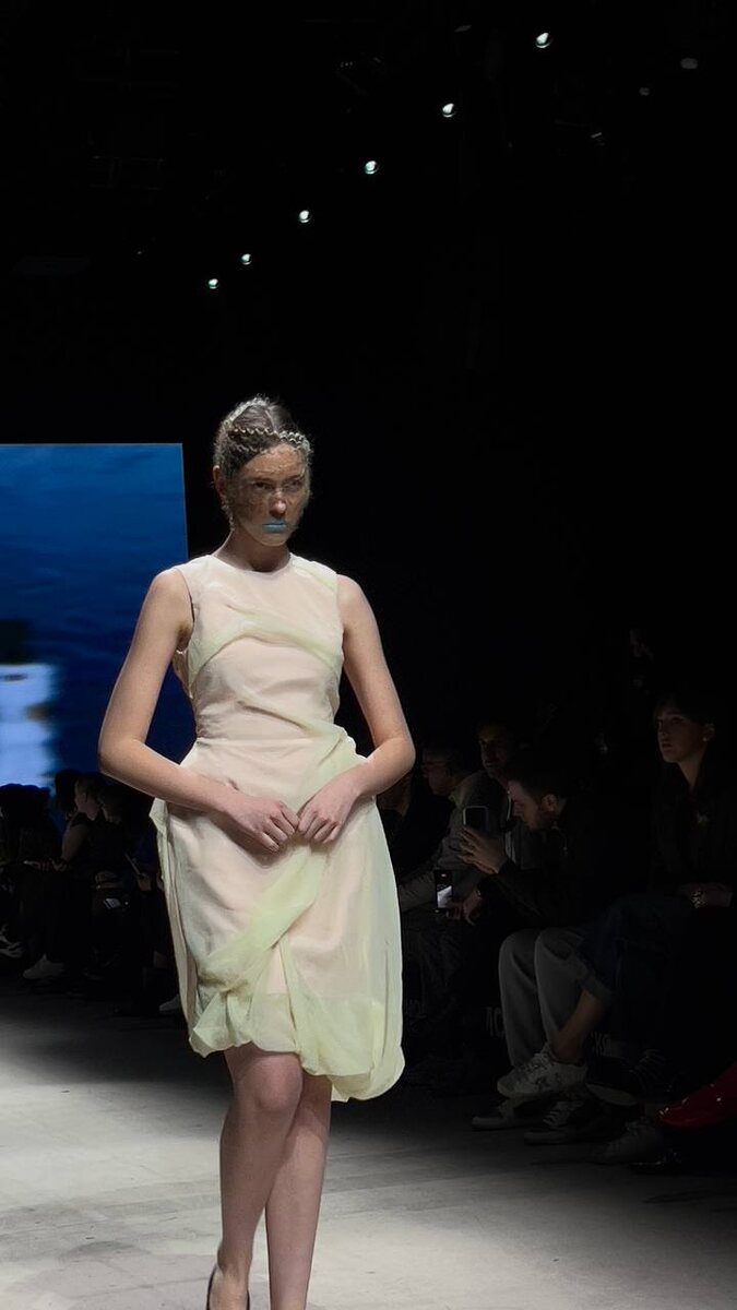 Эта идея буквально «плывет» по всей коллекции: в платьях с нарочно искаженными принтами, где угадываются силуэты людей и цветов, будто увиденные сквозь толщу воды. В основе — тонкий баланс между спортом и романтикой. Функциональные капюшоны с затяжками, юбки с кулисами и комбинезоны с большим количеством завязок. Бьюти-образы продолжают эту водную метафору: спутанные пряди липнут к лицам, словно после погружения, румянец выглядит влажным, а цвет на губах растушеван за границы контура — как будто его размыли волны. В результате модели напоминают современных русалок, только что вышедших на берег. ✔️ PROfashion Channel