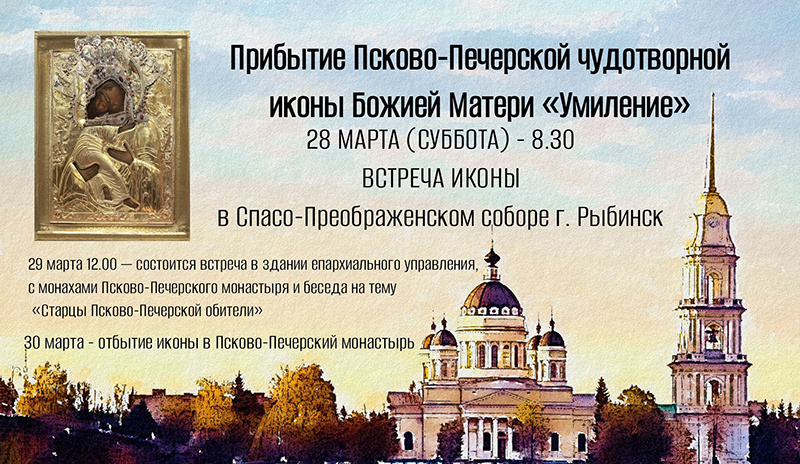 Из Псково-Печерского монастыря28 марта Рыбинск посетит чудотворная икона Богоматери «Умиление» Псково-Печерская. Два дня она будет находиться в Спасо-Преображенском соборе.Торжественная встреча иконы состоится в соборе 28 марта в 8.30. Ежедневно перед святыней будут совершать молебны.29 марта в 12.00 состоится встреча с монахами Псково-Печерского монастыря и беседа на тему «Старцы Псково-Печерской обители». Мероприятие пройдет в Епархиальном управлении, Крестовая 3, 3 этаж, актовый зал.Кстати:Псково-Печерская «Умиление» — список с знаменитой Владимирской иконы, выполненный в 1521 году благочестивым иноком Арсением (Хитрошем).Икона стала широко известна после событий 1581 года, когда армия польского короля Стефана Батория осадила Псков. Во время осады вражеское ядро попало в образ Богородицы, поставленный на городской стене, но повредив ни икону, ни защитников города . Враг так и не смог взять Псков.Название «Умиление» (Елеуса) образ получил за трогательное изображение Богородицы, нежно