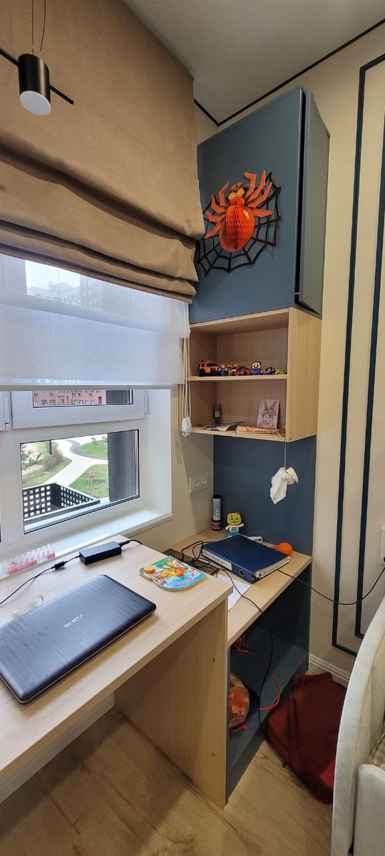 Комплект выполнен в двух цветах. Синий и Дуб Винченца с древесной текстурой. Интересны конструкции пеналов слева и справа от окна. Они собраны из двух отдельных модулей. Открытые полки развернуты в сторону столешницы, а верхние два закрыты распашными фасадами с открытием от нажатия и повернуты фасадной частью в сторону комнаты. Таким образом, получились удобные открытые полки, которыми комфортно пользоваться каждый день и две глубокие, вместительные закрытые зоны хранения. Шкаф выполнен в том же стиле и в тех же цветах, что и стол. Отлично сочетаются по стилю. Все фасады и ящики открываются от нажатия, что позволяет отказаться от наличия ручек. Всегда готовы бесплатно проконсультировать и помочь с решением мебельных задач. Запись на бесплатный замер и консультацию по телефону (или через WhatsApp, Telegram, Max): +7-903-798-98-56 Елена +7-903-720-72-70 Юрий #стол #рабочая_зона #рабочее_место #мебель #мебель_на_заказ #стол_на_заказ #мебель_по_индивидуальному_проекту #стол_по_индив