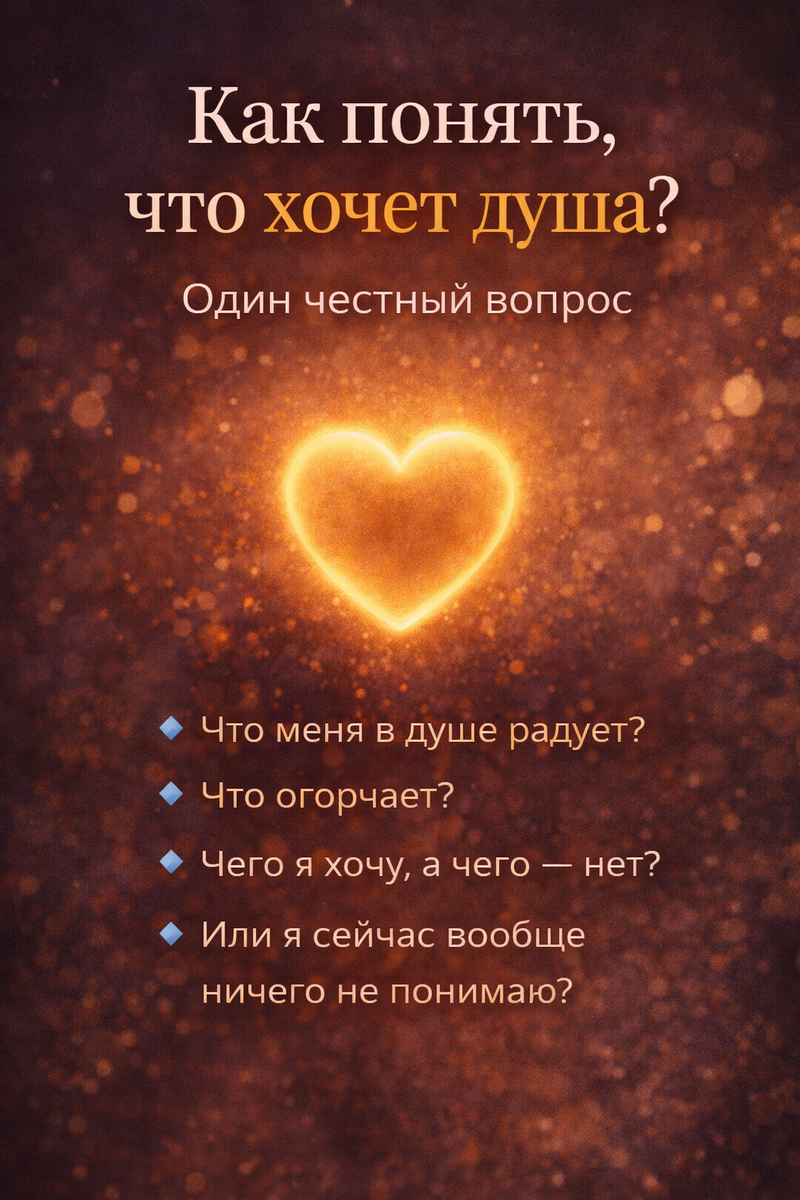 Всё, что вам нужно — это смелость задать себе один вопрос и честно на него ответить Содержание: Мы часто ищем сложные ответы. Ходим к психологам, читаем книги, проходим тренинги. А ответ на главный вопрос на самом деле очень прост. Что хочет моя душа? Чтобы ответить, нужно иметь смелость честно рассмотреть: 🔹 Что меня в душе радует?