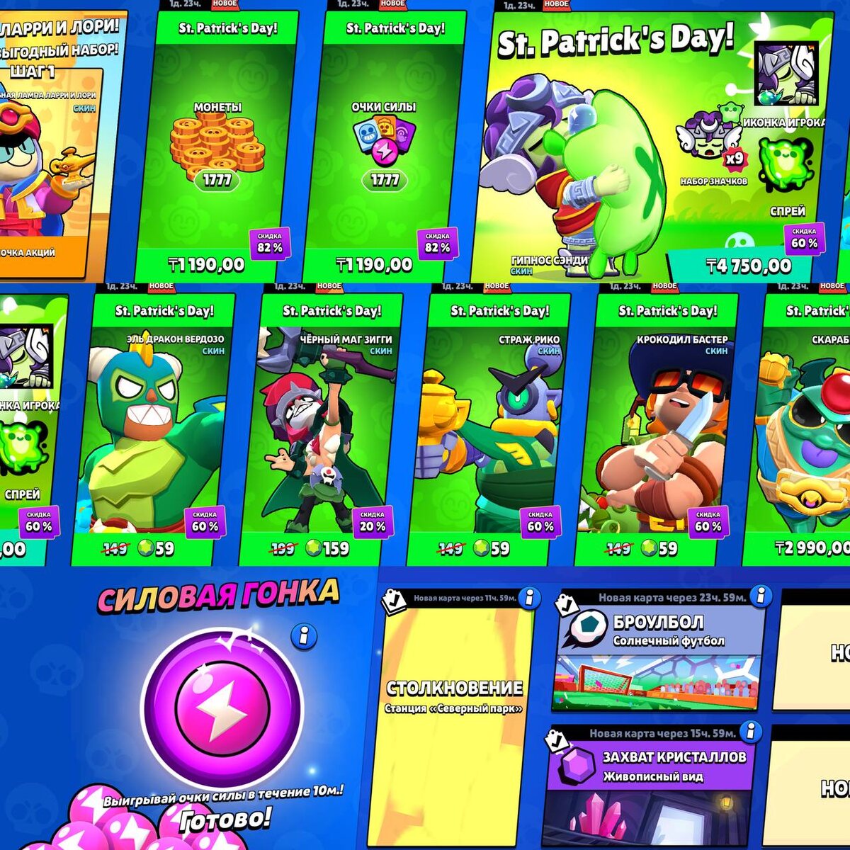 В Brawl Stars выпустили очень много акций в честь Дня Святого Патрика. Можно приобрести скины по скидке до 60%, в том числе и легендарный скин на Сэнди по вкусной цене. Также доступна Силовая Гонка, лутаем очки силы за победы. ✅Новости по Clash Royale - ТЫК Мир Supercell. Подписаться